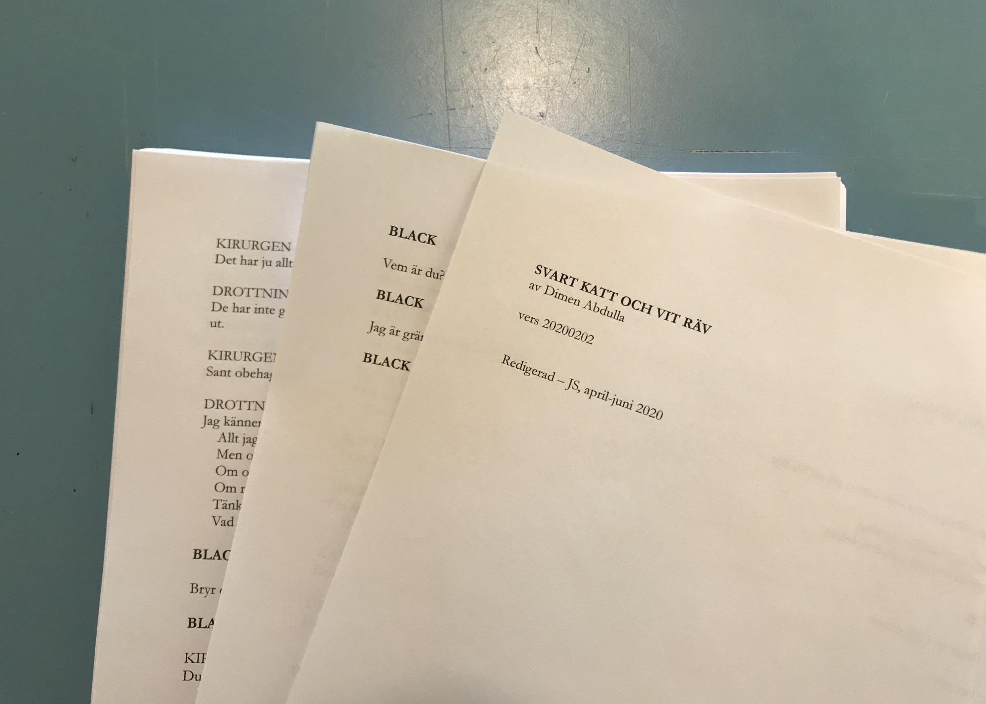 Den täta texten framförs av studenter från Teaterhögskolan i Luleå som efter regi från Abdulla, textdramaturgi av Joakim Sten och regiassistans från skådespelaren Amina Szecsödy, har dirigerats i en Beckettartad-koreografi. Arbetet med föreställningen har växt fram under en intensiv vecka av inläsningar och workshops på skolan i samarbete med skådespelaren Ulf Friberg. Skådespelare i föreställningen: Alexandro Soltani, Astrid Tägt, Amanda Kilpeläinen Arvidsson, Ivar Forsling, Astrid Gislason, Christoffer Rigeblad, Jannie Östergren och Natalia Fuentes Araya.