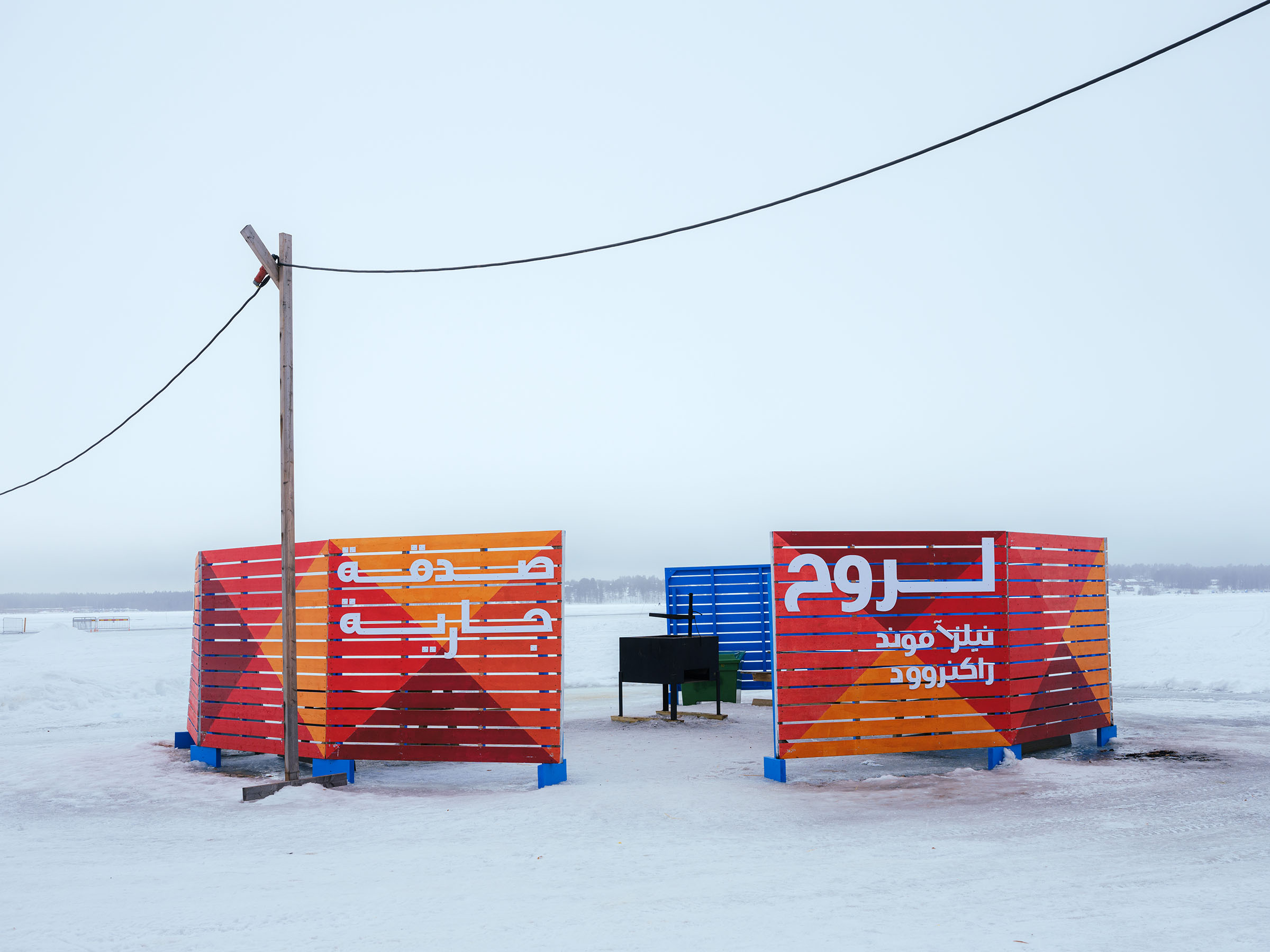 During the winter of 2023-24, artist Fadlabi transforms Luleå’s Ice Road wind shelters. Using the wind shelters as canvases, he infuses these structures with colours, patterns, and calligraphy inspired by his Sudanese roots and by how its diverse cultural practices express forms of community care, both among the living and in relation to those who have passed. In spring, after the ice has melted, these colourful structures are repurposed and installed in the neighbourhood of Hertsön in Luleå.