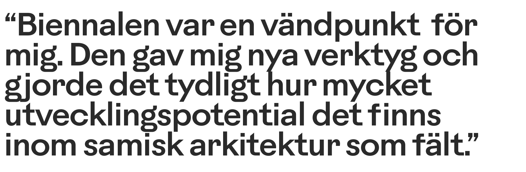 Som arkitekt hamnar man ofta i att arbeta med projekt på löpande band. Man tar sig an ett uppdrag och löser det, sedan går man vidare till nästa och löser det. Här finns väldigt lite tid att överskrida gränser och det finns alltid en klient som betalar och vars intressen formar arbetet. I den meningen var biennalen en vändpunkt för mig. Det placerade mig i en ny position, gav mig nya verktyg och synliggjorde för mig hur många möjligheter det verkligen finns – och hur mycket arbete som återstår att göra – inom samisk arkitektur.